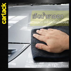 แล้วเช็ดด้วยผ้าแห้งหรือ ไมโครไฟเบอร์ วิธีนี้จะช่วยเก็บคราบมันเงาของน้ำยา และ ช่วยให้ผิวน้ำยาเคลือบสีบนกระจกเรียบเสมอกัน เมื่อปัดน้ำฝน ใบปัดก็จะไม่สะดุดอีกด้วย